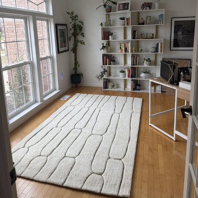 [This review was collected as part of a promotion.] Looks just like the photos - it's soft and plush. The rug does dip in where the lines/pattern so it's not even but that is to be expected with this design. We are using this rug in our nursery and it is the perfect minimalist/clean vibe!
