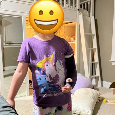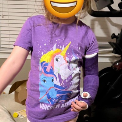 My five year old is a unicorn academy fiend and was flipping out over this shirt! It’s actually pretty high quality. The purple is sort of heathered and the image is nicely screen printed on so I don’t think I’m going to have to worry about it peeling off. Nice and long too which is great for my tall little gal. For reference I got a medium for my daughter who wears 7T and this fits her beautifully.