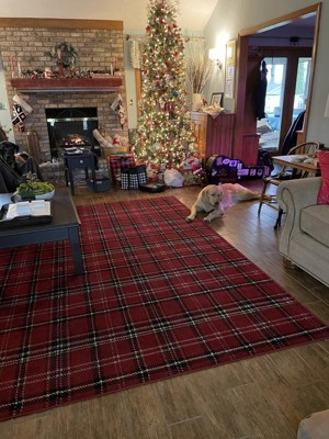 Best plaid Christmas rug! Don’t bother going to Amazon for the blankets disguised as rugs. It’s thick so you vacuum it easily, doesn’t shed, rich red color, stays in place, and is perfect for a Christmas rug that doubles as a place to catch the snow, ice and salt.