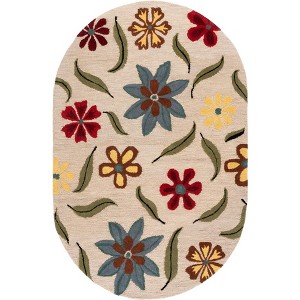 Introducing our charming 5' X 8' Oval area rug, a perfect blend of style and craftsmanship straight from the heart of India. This hand-hooked wool masterpiece is a testament to traditional techniques blended with contemporary aesthetics. The rug features a harmonious beige base that sets the stage for a lively multi-color floral pattern. The playful array of flowers dancing across the rug presents a palette of red, yellow, orange, blue, and green, which adds a pop of color to any room while maintaining an overall warm and inviting feel.