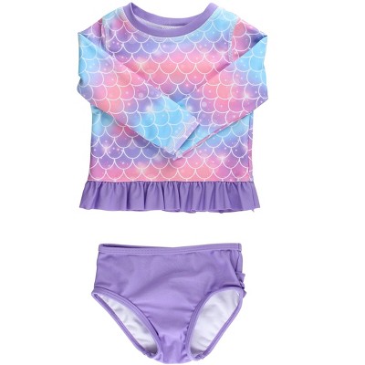 Neon Ocean Coral Long Sleeve Rash Guard 2-Piece Swimsuit, with Signature Rear Ruffles, is the perfect choice for your little girl's beach and pool adventures. This multi-color girls' swimsuit combines vibrant neon coral with ocean-inspired hues, making it a stylish standout. Designed with long sleeves for optimal sun protection and enhanced with UPF 50+ to safeguard her skin, this set ensures she plays under the sun safely and comfortably. The top features a neon coral rash guard that resists pilling and snagging, ensuring durability and long-lasting wear. The stretchy swimwear for girls is made with a 4-way stretch fabric that moves with her, perfect for all her water activities. The ruffle detail adds a fun, girly touch, especially with the signature rear ruffles that give it a unique flair. Offering full seat coverage, this girls' rash guard with ruffles is not only protective but also incredibly charming and functional for all-day play. This is part of the vibrant Neon Ocean Coral Collection, designed specifically to keep your little one both safe and stylish by the water.