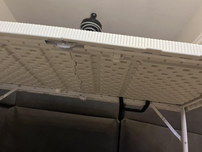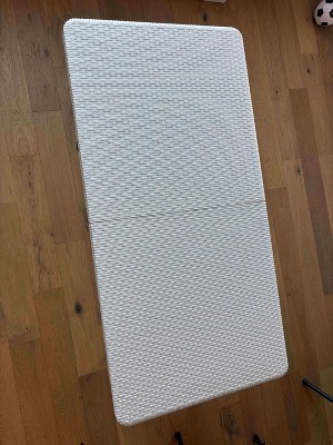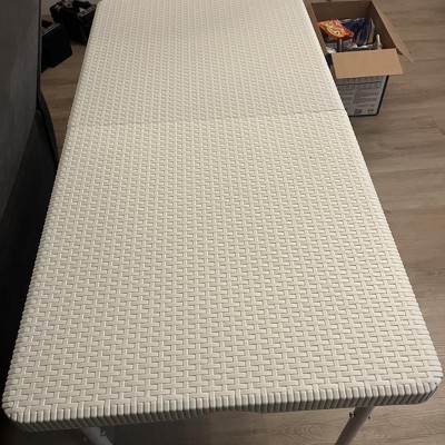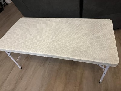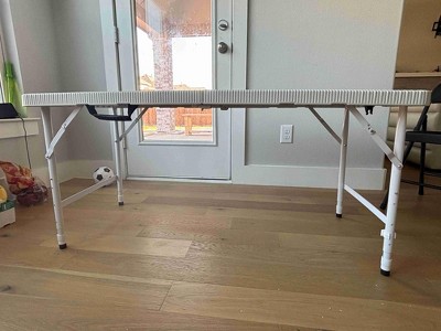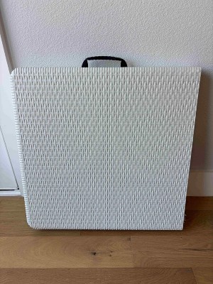 This table is perfect for my needs. The white rattan design is vergy good and looks nicer than the standard plastic tables. It feels very sturdy and still light enough to carry easily. I like that it folds in half for storage. It works great for both picnics, crafts and for both indoor and outdoors.