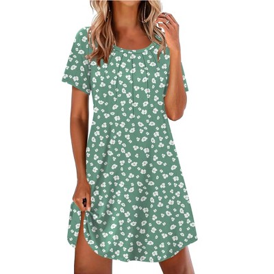 • A: It features a v-neck, pleated front, loose short sleeves, and a knee-length design.