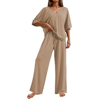 Ekouaer Lounge Sets for Women Short Sleeve Tops and Long Pants Soft Comfy Pajamas Set 2 Piece Outfits Khaki M