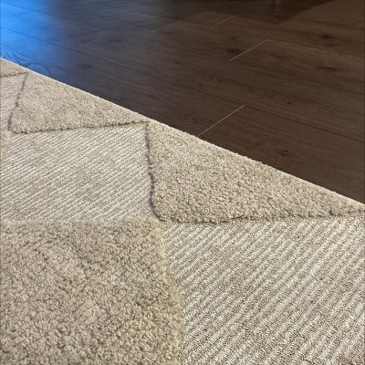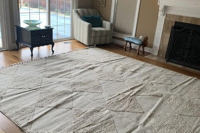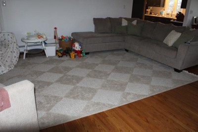 I love the look of this rug. It’s perfect in our large space. I am also happy with how quickly the rug flattened after unrolling it. My only complaint is that there are a couple of snags in the material, and there is also a small portion of discolored material. Nothing that was significant enough to return it though.