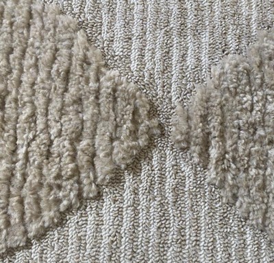 • A: The rug features a .67 inch high/low pile height, providing a textured feel.
