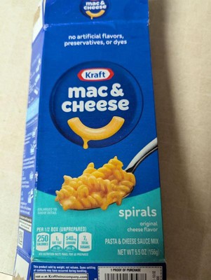 Help yourself to a bowl of comfort. Kraft Mac & Cheese Spirals is a convenient boxed dinner. Kids and adults love the delicious taste of macaroni with cheesy goodness. Our 5.5 ounce mac & cheese dinner includes spiral pasta and original flavor cheese sauce mix, so you just need milk and margarine or butter to make a tasty mac and cheese. Macaroni and cheese is a quick dinner kids love. With no artificial flavors, preservatives or dyes, Kraft Mac & Cheese is always a great family dinner choice. Preparing macaroni and cheese is a breeze. Just boil the pasta for 6-8 minutes, drain the water and stir in the cheese mix, milk, and margarine or butter. Kraft Mac & Cheese inspires the positive power of comfort.