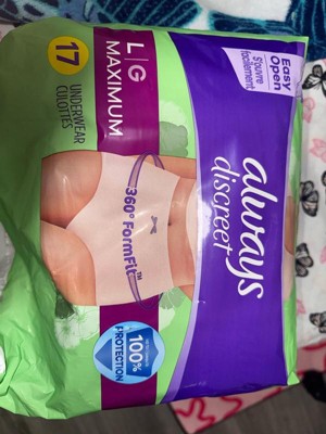 Try Always Discreet incontinence underwear for women. These reimagined adult diapers for women have up to zero leaks, zero odor, and zero bulk when wet for incontinence protection you can depend on. Designed to fit up to 95% of body shapes, these reimagined adult diapers for women range from sizes 2-26W+. Perfect for everyday use and also ideal as postpartum underwear, our products have a cottony soft 4 way stretch that fits like real underwear. These innovative disposable underwear for women feature a super absorbent core that wicks away moisture and turns liquid to gel, ensuring up to 12 hours of maximum absorbency and up to 100% leak-free protection you can depend on. These reimagined adult diapers for women also have LeakGuards that help contain leaks and prevent incontinence overflow and Odorlock technology that continually neutralizes odor. These lightly scented incontinence underwear for women are 40% drier* (*vs. leading brand) for all day freshness and confidence. As an HSA/FSA eligible product, managing your incontinence has never been easier. Embrace life without limits and choose Always Discreet - reimagined adult diapers for women you can depend on! Love it or your money back (*see alwaysdiscreet.com for full details. Refund issued by mail via prepaid card. Terms of prepaid card apply. Original receipt and UPC required within 60 days of purchase. Limit one).