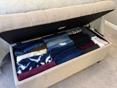 I purchased this ottoman to store blankets. The two blankets that were stored on the far ends of the ottoman are now stained with dark black dust of some sort. I imagine it is a result of the hinges rubbing against the inside material of the ottoman over time. Regardless, I now have a weighted blanket and a large white plush blanket with several black marks on each. I am not quite sure how to get the stains out and I’m afraid to keep my other blankets in the ottoman now. Target should fix this for me by replacing my blankets and/or getting me a new storage ottoman that doesn’t stain my blankets.