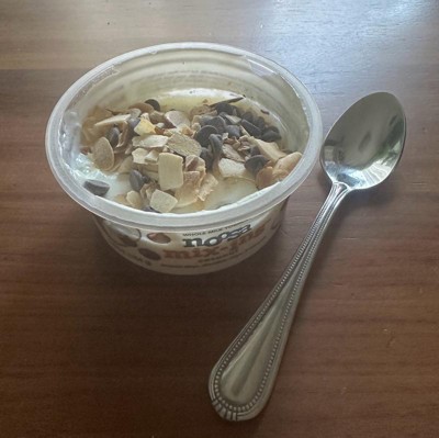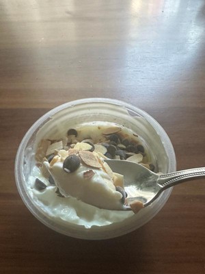 [This review was collected as part of a promotion.] The flavor on this is tart & gives a sour cream feel which is not my preference for yogurt. The whole milk base separated a bit even though it was far from expiration — it just did not smell, taste, or look very fresh. It’s a whopping 300 calories for someone looking for yogurt meal replacement but with the almonds, coconut, & chocolate chip i feel it’s a more desert type of yogurt which is why the intense tartness through me off completely. Lastly, the packaging did keep the toppings fresher. Overall, no thank you!