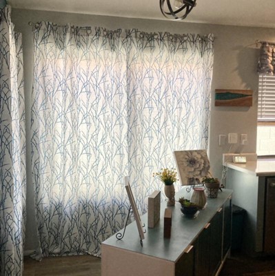 Purchased the sea foam color for our lake home. Tons of windows in this room. Wanted something that would lighten the room, but still filter out enough light when we watch TV. The branches add a nice detail. In the pic the blinds on the left are up, but down on the right so you can see the difference with the curtains drawn.