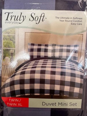 [This review was collected as part of a promotion.] I'm kinda on the fence with this duvet cover set. It is a pretty cover, the black buffalo plaid is one of my favorite patterns and wanted to use this in my guest room. However, I'm confused as to where the ties are to keep the blanket in place and prevent it from sliding. I found it rather annoying to have to keep straightening the cover and adjusting the blanket. The cover in terms of comfort is exceptional, it features a button closure along the side, and comes with 2 pillow shams in the popular pattern black buffalo plaid. The dimensions were perfect for my queen size mattress and definitely gave the room a whole new look. I would absolutely recommend the Truly Soft brand and this everyday cover set.
