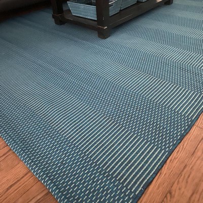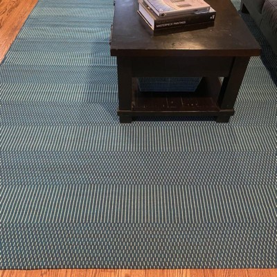 I love this rug on our patio! We have heavy metal chairs and I wanted them to slide better so I got the rug, but it adds such a nice pop of color too! The lighter threads make a cool pattern and they are not white but a light blue. The other side is also cute, so it could be reversible, but that side is not as soft. The rug is thick and good quality. I’ve had it for a couple of weeks and it’s still bright despite the sunshine and rain. It dries pretty fast in full sun. Seems durable and I’m happy with my purchase! And the pup likes it for sunny naps :)