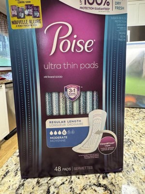 • POISE ULTRA THIN INCONTINENCE PADS: 48 incontinence and postpartum bladder leak pads, 4 Drop Moderate Absorbency, long length (48 pads total)