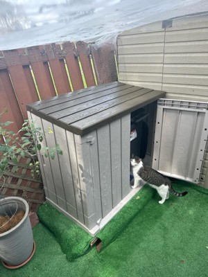 [This review was collected as part of a promotion.] The back panels are just cardboard. Some parts arrived broken. The product breaks easily when you try to piece the parts together. I had a few plastic pieces break during assembly. It was frustrating to assemble. It is a beautiful neutral color, but I am disappointed that it will probably not make it through snow and rain. I live in MN, so having a more waterproof and weather proof product is necessary. It gives you a great plastic floor and I can put some things inside. The purpose of a lock feature is defeated by the cardboard. Someone could kick in the back end too easily, including outdoor critters.
