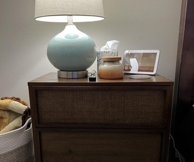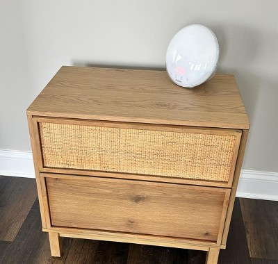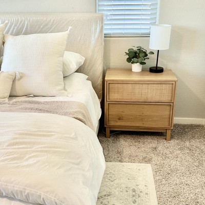 Transition the look of your bedroom with the natural charm of this Wood and Cane Transitional Nightstand from Hearth & Hand™ with Magnolia. Crafted from wood, this rectangle nightstand has a natural finish to easily integrate into your existing decor style. Designed with two built-in drawers — one with wooden accents and the other with decorative lattice, this nightstand offers ample space for your books and other keepsakes you want close by. Simply place this wooden nightstand near a coordinating headboard to spruce up the look of your bedroom.
