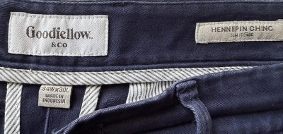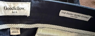 these were NOT goodfellow and Co chino pants. They sent me Tommy HiLfiger pants and not even the size I ordered. They have some kind of scamming going on online with Target is a supiscion of mine right now. I am wondering hot the heck I am going to return these. They do not match what I purchased online!