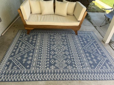 Quite happy with this pretty rug! The shade of blue is just what I was looking for and really sets off the dining area on our patio. I was glad to find the square size as a lot of the rugs I looked at weren't quite the right dimensions. It was easy to roll out and flattened right away. It did have a strong smell at first, but that cleared out quickly with it being outdoors. We will see how it handles being out in the weather, but so far it is just what I wanted.