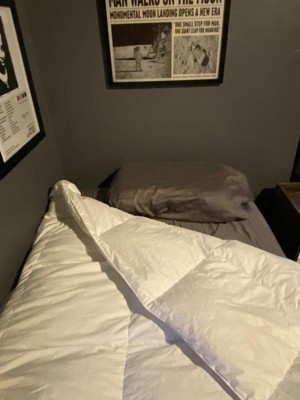 The All Season Warmth Down blend comforter takes a very unique approach to keep you toasty warm and fluffy on those cold winter nights. Most down blend comforters are just that, a blend of down and feather throughout the entire comforter. Our comforter features a proprietary construction that puts only high quality 550 Fill Power white down in nearly two-thirds of the comforter (the part you sleep under) and fills the side panels (the part that hangs over the edge of your bed) with a blend of 80% feather and 20% down. With a little over 55% of a comforter resting on top of your mattress and the remainder falling over the edges, we’re giving you more down where you need it. Four corner loops on the comforter can be tied to help secure it within a duvet cover. The end result is you’re sleeping underneath a high-quality comfortable white down comforter for the price of a down blend comforter. Our oversized comforter is constructed with a 233 thread count, 100% cotton down proof percale cover throughout and the white down-filled section features end-to-end sewn-through box quilting to ensure that you’ll never have any cold spots due to the downshifting around.