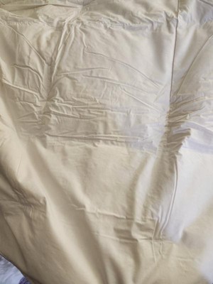 [This review was collected as part of a promotion.] I got this comforter to replace my current down comforter, and I am so happy that it is 100% cotton! I love the warmth of down in the winter and this one is just right. I also like the size of the comforter. It is a little bit bigger than most queen/full comforters which allows it to hang over the side of the bed a little more. It came packaged nicely and fluffed up well. And, I am glad it has the hooks to tie a duvet cover on. I like that it is cotton for breathability and I feel like it helps keep the down in place, however, it's not an overly soft cotton and the stiffness makes it very noisy. I've tried fluffing it in the dryer to try and soften it, and adding a duvet cover to soften the noise, but so far no luck. I'm hoping over time it will get better and will continue using it in the meantime, but it really can be a bit bothersome if you're trying to get comfortable and get to sleep.