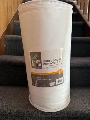 [This review was collected as part of a promotion.] My sleep has improved greatly since having this comforter. I am no longer waking up in the middle of the night kicking my feet out from being too hot. It is not heavy or bulky so I don't feel pinned underneath it. Unlike my last all cotton comforter this one does make the crunchy sound but this does not bother me at all. It fits comfortably into a duvet cover, which is how I have mine. It is white in color and looks classy on its own if you prefer not to use a duvet. When True North says oversized they mean oversized! I don't usually like a comforter that hangs too far over my bed so the full/queen size is perfect for me. It fits nicely on my Cali King bed. It covers the whole bed and hangs over just enough (how I like it). It is made of 75% duck down and has three levels of warmth, I have level 2. It keeps me comfortable, not too hot and never cold. It is machine washable in warm water on the gentle cycle and can be dried with warm heat setting. It is a quality down comforter that provides a lot of comfort for me.