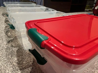[This review was collected as part of a promotion.] The colors red and green are so Christmas and make the containers very conspicuous in my garage. I don’t need to open the containers to know it’s for Christmas. What a smart way to distinguish! The quality is good, the plastic is thick and sturdy, and does not bend when I press it. Look durable to me. Clips are easy to use. A set comes with 6 containers, enough for my Christmas decorations. Highly regarded this set for Christmas storage!