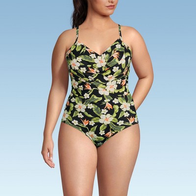 Lands' End believes every body is a beach body! Whether you're going to aqua aerobics running through the sprinklers with your little ones or taking a beach vacation all you need is the right swimwear. And we think this women's plus size SlenderSuit swimsuit is a wonderful choice. Made from durable LYCRA Xtra Life spandex this slimming bathing suit will hold onto its shape through many washes and wears. The amazing SlenderSuit fabric keeps your tummy in check while smoothing away lumps and bumps. And it even provides UPF 50 sun protection - the highest you can get - to prevent burns. We've also added a gorgeous wrap design a flatttering v-neck cut and a wire-free soft cup bra that provides a boost where you need it most. Don't forget to pack this ladies swimsuit when you're heading off on a trip. The glamorous retro-inspired style is right at home in a luxurious resort - or wherever you may find yourself. Just add strappy sandals dark sunglasses and a sarong to complete your look.