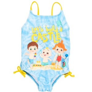 Featuring JJ, Yoyo and Tomtom from Cocomelon at the beach with phrase "Let's Build a Castle" on this comfortable and stretchy bathing suit