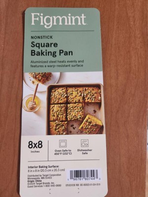 This 8-Inch Nonstick Aluminized Steel Square Baking Pan from Figmint™ makes it easy to bake brownies, cornbread and much more. Made from wire-reinforced aluminized steel that heats evenly and resists warping, this square baking pan features a smooth, easy-to-clean nonstick surface. Made without PTFE, the pan is oven safe up to 450 degrees and can be tossed in the dishwasher for easy cleaning.