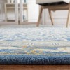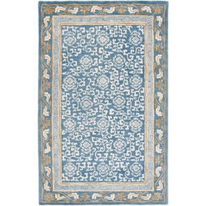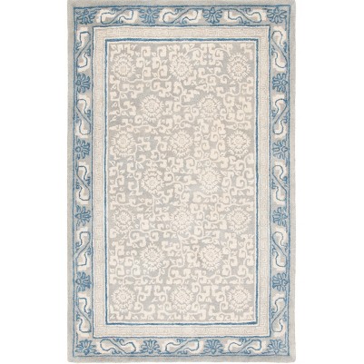 Designed with a rich blue and ivory color palette, this rug boasts a timeless pattern that exudes elegance and detailed intricacy. The motif features classic florals and ornate scrolls that marry traditional style with modern versatility. The rug's border is accentuated by a complementary Greek key-inspired pattern, adding a distinctive frame to the central design.