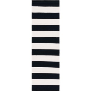 At 2 feet 3 inches by 12 feet, with a slim profile of a 1/4 inch height, this runner rug is designed to fit seamlessly into your living space, adding elegance without overpowering. Its black and ivory hues form a bold, striped pattern that commands attention, creating a striking visual that's both classic and modern.