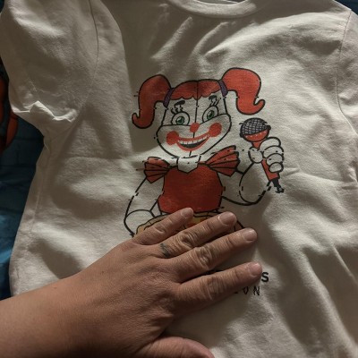 If Freddy Fazbear's is a little too creepy for you, maybe you'll enjoy their sister location and this Five Nights at Freddys Shirt better! The Circus Babys Pizza Shirt is an all white youth girls tee made of 100% cotton material that is soft and comfortable to wear on any occasion. The Freddy Fazbear Circus Baby's Shirt features a bright, bold, soft hand print graphic of Circus Baby across the front of the tee. The Circus Babys Youth Apparel is machine washable for quick, easy care and is available in girls youth sizes XS - XL. It's a great Circus Baby Girls Graphic Tee for any girl!