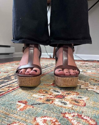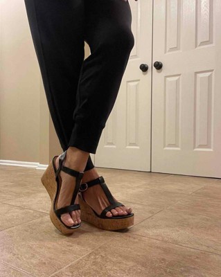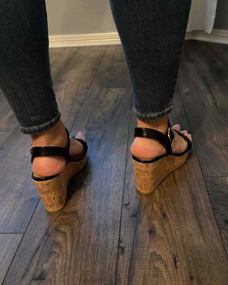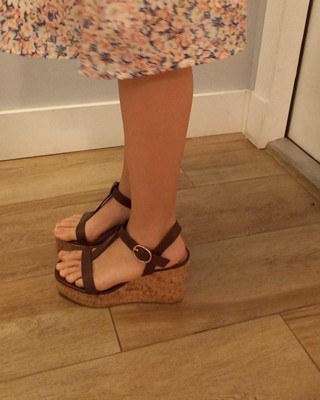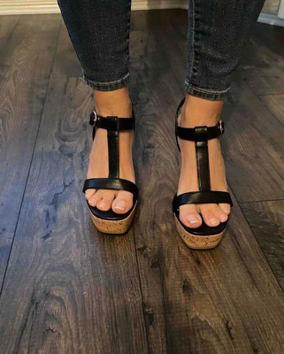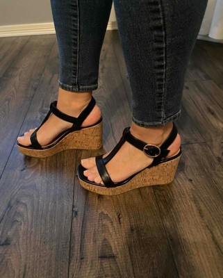 The Matilda faux cork wedge sandal from Journee Collection will leave your feet comfortable all day with their 4 mm � insole. Their luxe vegan leather T-strap design and buckle ankle strap will keep you up to date with all the fashion trends. As a bonus their open square toe will be the best fit to take you from occasion to occasion.