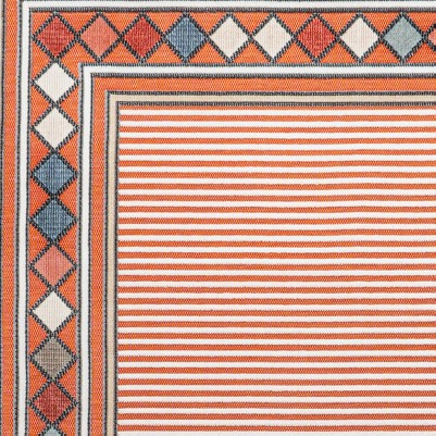 This rug features a modern color palette and bold geometric border with a striped central field. With its kid-friendly busy pattern, our textured rug is ideal for a kitchen, living room, office, or porch. The pet-friendly, indoor-outdoor synthetic fibers are easy to clean.