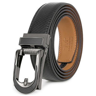 Our Mio Marino dress belts are made of high-quality genuine leather concealed with fortifying polyurethane. They are crafted with fine leathers that breathe, repel moisture, and age gracefully. Slip the belt in. Secure. Auto locks. To release, just lift the buckle to obtain an inaudible, smooth release! LINXX BUCKLE - Lift the buckle to obtain an inaudible release! Slide belt in to tighten and the belt auto locks - simple smooth and sleek.