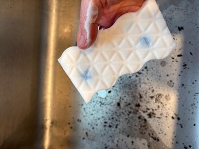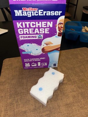 [This review was collected as part of a promotion.] This Mr. Clean Magic Eraser does a great job of cutting through the dirt and grease. It was very easy to use — once wet it lathered up really well with suds. Left my sink looking shiny. Only complaint was after using, the eraser started falling apart so really could only get one use from it.