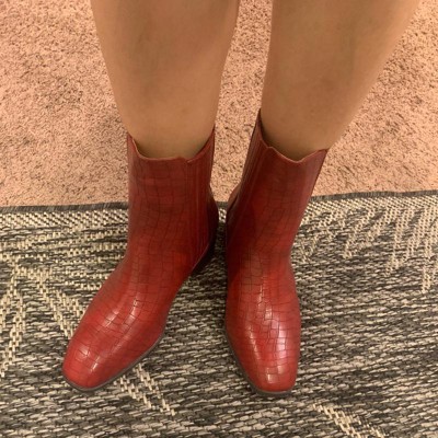 Who can resist these red snakeskin boots. I wear size 7.5-8 normally and these in 8W fit ok. I can wear with thin socks. They’re medium soft I’d say. Got wide width but they’re not very wide due to almond toe. Would be nice with a more square toe design. Heel is fine stable and walkable. Not too stiff.