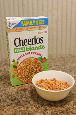 - CONTAINS: One cardboard box of crunchy Cheerios Veggie Blends Breakfast Cereal, Apple Strawberry, Family Size, 18 oz; Perfect for instant snacking, or a part of breakfast and meals