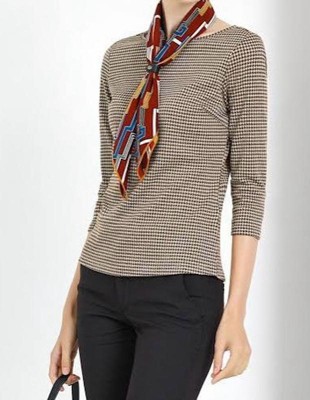 [This review was collected as part of a promotion.] I love the look of this top! It looks so awesome with this scarf and without! It’s also great alone with my black pants cropped looking like Audrey Hepburn! I love the boat neck the softness and that it’s easy to care for!