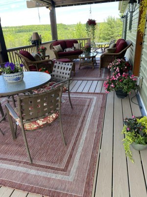 Lovely rugs!! Color is more light burgundy than red. Looks beautiful with my burgundy Sunbrella cushions. Color is broken up with lighter color (tan/cream) woven throughout. Highly recommend.