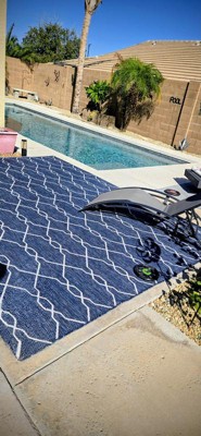 Durable and comfortable rug. I live in Phoenix and this outdoor rug sits poolside to help navigate poil exits and dog traffic outside (have 3 dogs). The cement in summer is too hot to walk on, especially for dogs. This rug withstands are inferno summers and pool water traffic, stays cool, and has vibrant colors. Definitely a great investment. We use the occasional weightplate to keep rugs securely on ground given we also get significance wind events.