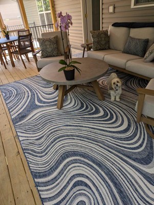 Love the contemporary look of this rug! We are so happy we chose this to accent the blue of our pool with our living area on our lanai. We still are going to add a few more pillows but love the rug to add color.