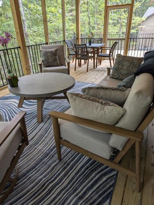 Blue swirling rug for lanai.