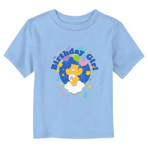 Caring is what counts, especially when it comes to caring about your favorite teddy bears with the officially licensed Care Bears Birthday Bear Girl Balloons Care Bears Toddlers' Graphic T-Shirt. From cuddly stuffed bears to tv shows and movies, the Care Bears have it all! Grab yourself a Care Bears tee today and spread a little joy in the magical realm of Care-a-Lot! The cute Birthday Bear is featured holding balloons on a fluffy cloud and encircled by the text "Birthday Girl" across the top.