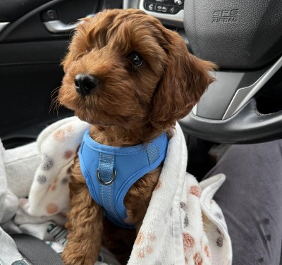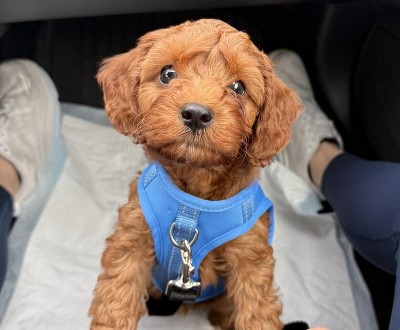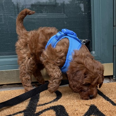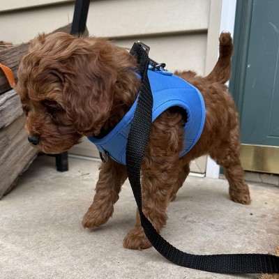We picked up our new puppy 2 weeks ago and love this harness. It was a bit loose on him but hes slowly growing into it - he was only 8 weeks old at that point. Its a beautiful blue color we absolutely love it and love how its so comfortable for him.