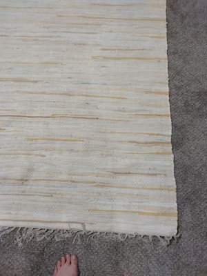A beautiful, well made Chindi rug! I love the other color variations within the rug woven within! I also love the fact that it is cotton and can be washed if needed. There is no rubber backing to it. It brightens up my wooden floors and ties in well with my other colors in the home. Definitely getting a couple more of these! A great deal!