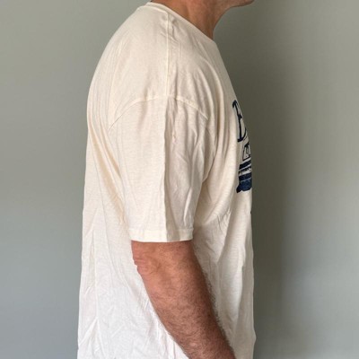 My husband typically wears an XXL, therefore, I had ordered an XXL in this T-shirt. The shirt fit well, therefore, I believe it fits true to size. This T-shirt has a vintage look to it. The fabric is 100 percent cotton , which is very soft and lightweight. It is an interesting fabric as it looks like it is pilling. My husband would recommend for comfort.