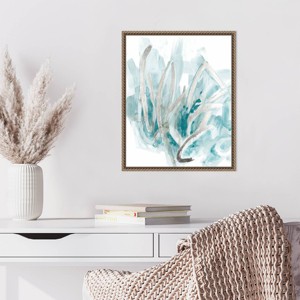 The artwork features dynamic brushstrokes in shades of teal and beige against a white background. The abstract, expressive composition creates a sense of movement and texture. Its minimalistic style is modern and captivating, making it a striking addition to any space. This canvas art print was created by June Erica Vess and printed in Waunakee, WI. The canvas is stretched by hand and finished with a float frame. Individually made using traditional custom framing techniques, it has the quality you would expect from your local frame shop.