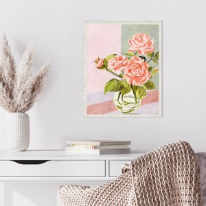 The artwork features a bouquet of pink roses set in a clear glass vase. The roses and green leaves are rendered in a delicate, soft style against a pastel background. The use of light green and pink shades adds a gentle and calming effect to the piece. This canvas art print was created by Melissa Wang and printed in Waunakee, WI. The canvas is stretched by hand and finished with a float frame. Individually made using traditional custom framing techniques, it has the quality you would expect from your local frame shop.