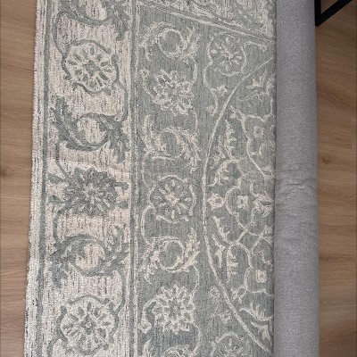 Rug doesn’t match what is shown in the photo. It was a mint green, not blue. In the photo it looks more creamy and white, but instead it was mainly mint green all k er. The design of the rug didn’t even match the photo. Such a shame because I was really excited about it. The quality looked good. Just wish it was the same rug in the photo.